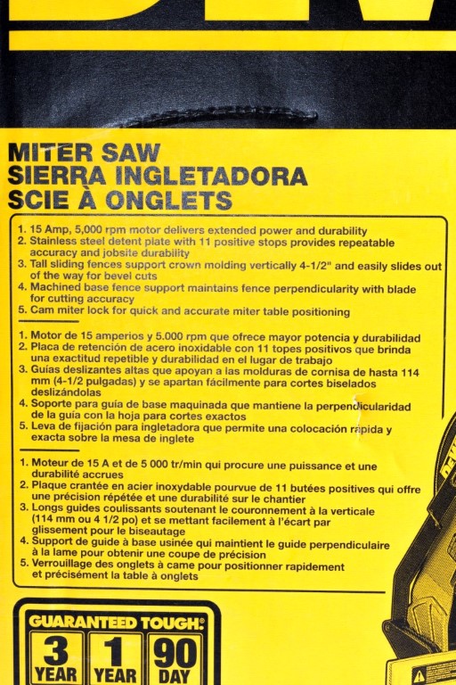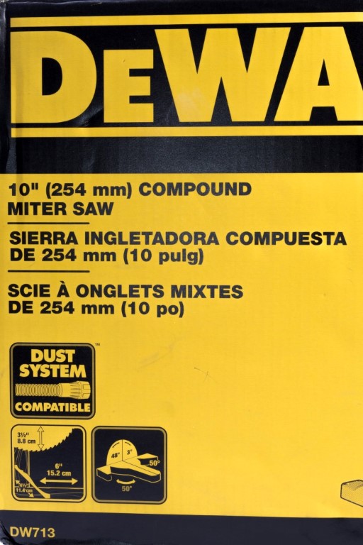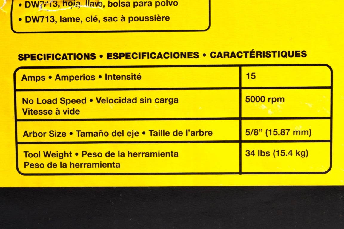 Sierra Circular Ingleteadora de 1.600W de potencia. Velocidad: 5,000RPM. Diámetro del disco 10" (254mm). Tamaño de eje 5/8" Máx. Profundidad de corte: 89 mm. Peso de la herramienta: 14 kg. Guía deslizante para cortes verticales de hasta 4-1/2" y cortes biselados de 3º a 48°a la izquierda. Incluye disco y bolsa recolectora de polvo