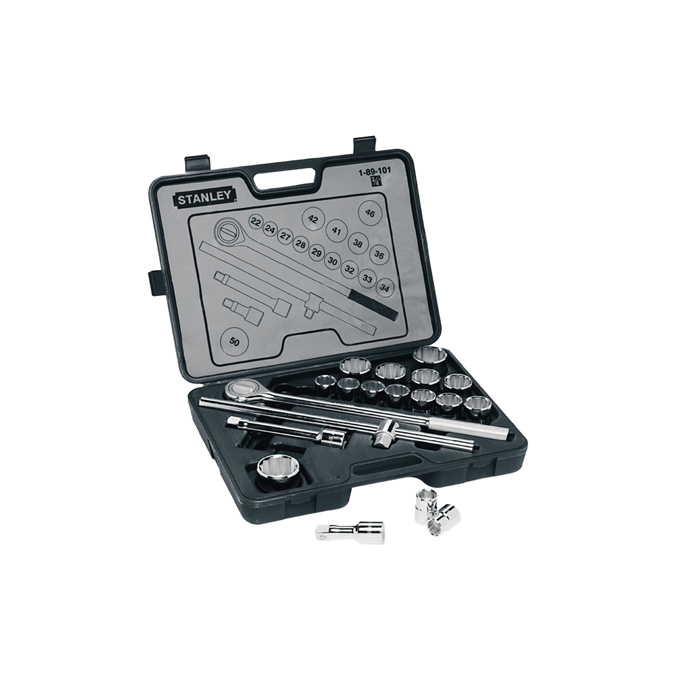 19 piezas · contenido · (1) 3/4 pul ratchet · (2) 200 & 400 mm extensión · (1) 250 mm barra deslizante “t” · (15) 22, 24, 27, 28, 29, 30, 32, 33, 34, 36, 38, 41, 42, 46 & 50 mm dados · (1) caja almacenaje