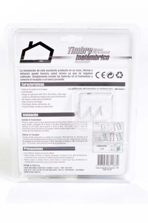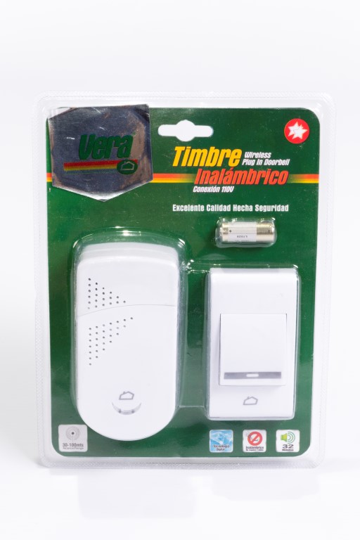 1 pulsador y 1 timbre, 1 batería, pulsador: utiliza 23a 12V/DC, receptor: 110v-130v (enchufe plano), frecuencia de trabajo: 315mhz sonido de la campana: 80 ~ 90db, distancia: Hasta 100m lineales puede estar afectado por equipos que cusen interferencia, tipo de sonido: 32 melodías, codificados. Es muy importante resaltar que cada control funciona exclusivamente para el timbre asignado (es una ventaja frente a los anteriores).