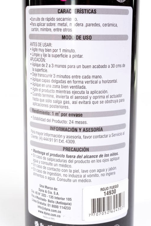 Pintura en aerosol multipropósito de acabado brillante, ideal para aplicar en diferentes superficies como madera, metal, cerámica o concreto. Fácil aplicación y rápido secado. Rendimiento aproximado de 1m2 por envase. Alta adherencia y cubrimiento. Presentación de 400 ML. Referencia 14930 Pinte.