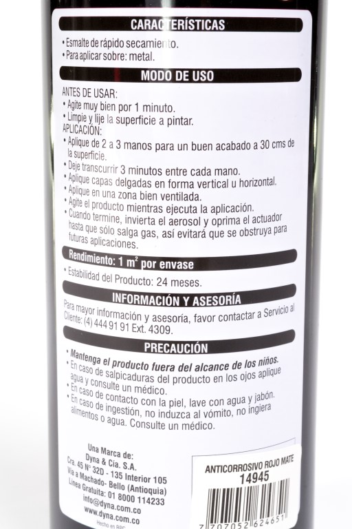 Pintura anticorrosiva en aerosol de acabado mate, resistente a la intemperie e inhibidora del óxido. Ideal para aplicar en superficies metálicas. Fácil aplicación y rápido secado. Rendimiento aproximado de 1m2 por envase. Alta adherencia y cubrimiento. Presentación de 400 ML. Referencia 14945 Pinte.
