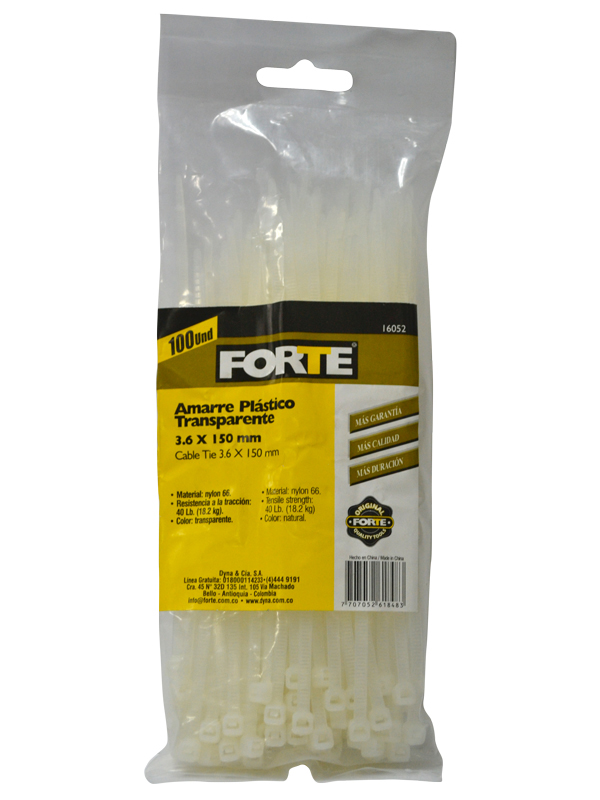 Ideal para sujetar y organizar cables.Amarre plastico, material: nylon 66, 100 pcs/ bolsa, -tamaño: 3.6 x 150 mm, resistencia a la traccion: 40 lb. (18.2 kg), color: transparente. Empaque x 100 Unidades.