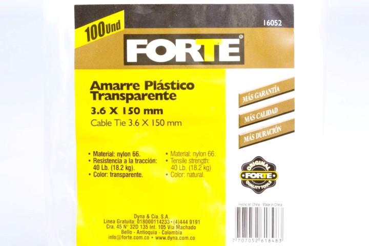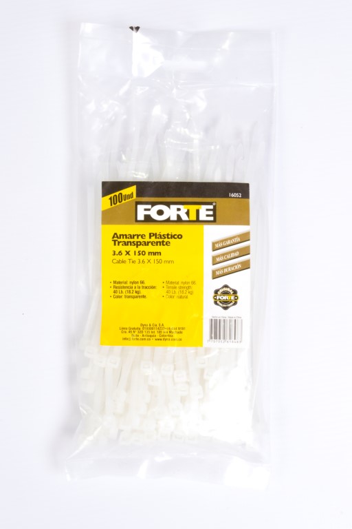 Ideal para sujetar y organizar cables.Amarre plastico, material: nylon 66, 100 pcs/ bolsa, -tamaño: 3.6 x 150 mm, resistencia a la traccion: 40 lb. (18.2 kg), color: transparente. Empaque x 100 Unidades.
