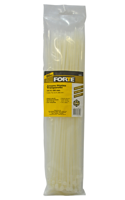 Ideal para sujetar y organizar cables.Amarre plastico, material: nylon 66, 100 pcs/ bolsa, tamaño: 3.6 x 300 mm, resistencia a la traccion: 40 lb. (18.2 kg), color: transparente. Empaque x 100 Unidades.