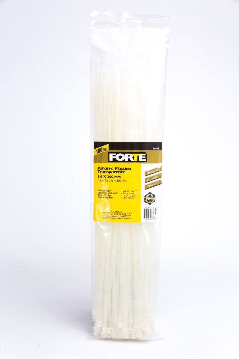 Ideal para sujetar y organizar cables.Amarre plastico, material: nylon 66, 100 pcs/ bolsa, tamaño: 3.6 x 300 mm, resistencia a la traccion: 40 lb. (18.2 kg), color: transparente. Empaque x 100 Unidades.
