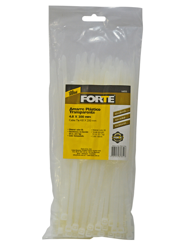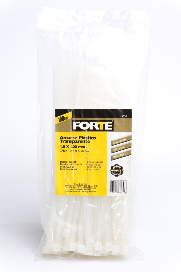Ideal para sujetar y organizar cables.Amarre plastico, material: nylon 66, 100 pcs/ bolsa, tamaño: 4.8 x 200 mm, resistencia a la traccion: 50 lb. (22.7 kg), color: transparente. Empaque x 100 Unidades.