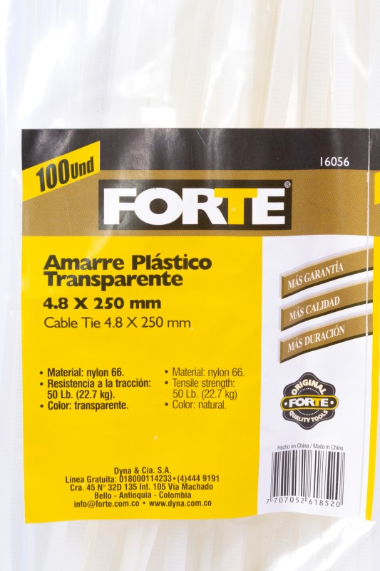 Ideal para sujetar y organizar cables.Amarre plastico, material: nylon 66, 100 pcs/ bolsa, tamaño: 4.8 x 250 mm, resistencia a la traccion: 50 lb. (22.7 kg), color: transparente. Empaque x 100 Unidades.