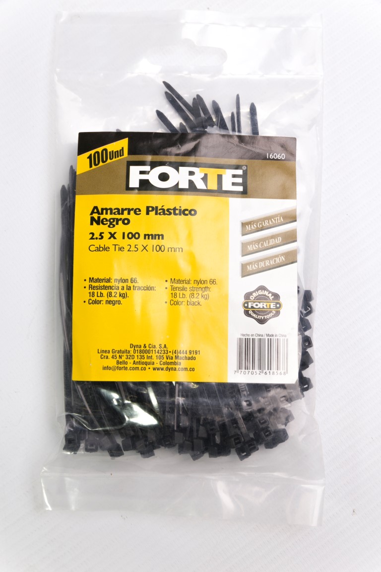 Ideal para sujetar y organizar cables.Amarre plastico, material: nylon 66, 100 pcs/ bolsa, tamaño: 2.5 x 100 mm, resistencia a la traccion: 18 lb. (8.2 kg), color: negro. Empaque x 100 Unidades.