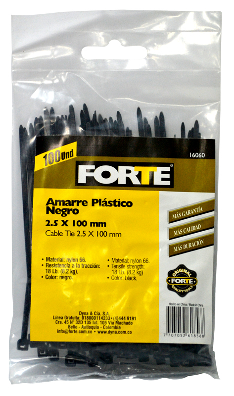 Ideal para sujetar y organizar cables.Amarre plastico, material: nylon 66, 100 pcs/ bolsa, tamaño: 2.5 x 100 mm, resistencia a la traccion: 18 lb. (8.2 kg), color: negro. Empaque x 100 Unidades.