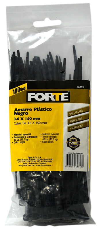 Ideal para sujetar y organizar cables.Amarre plastico, material: nylon 66, 100 pcs/ bolsa, tamaño: 3.6 x 150 mm, resistencia a la traccion: 40 lb. (18.2 kg), color: negro. Contiene 100 Unidades.