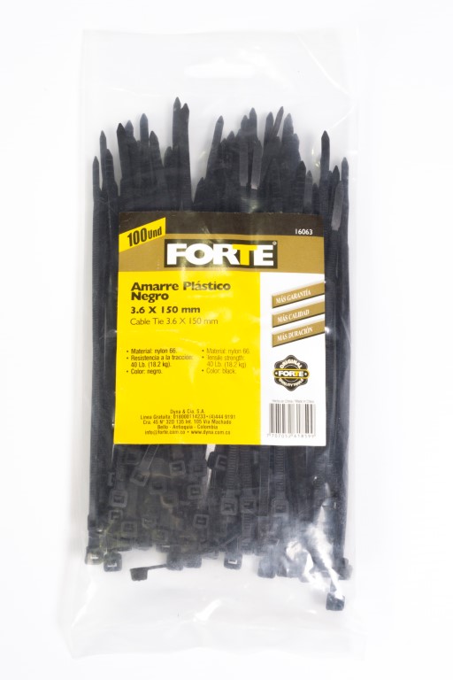 Ideal para sujetar y organizar cables.Amarre plastico, material: nylon 66, 100 pcs/ bolsa, tamaño: 3.6 x 150 mm, resistencia a la traccion: 40 lb. (18.2 kg), color: negro. Contiene 100 Unidades.
