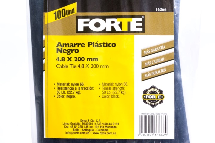 Ideal para sujetar y organizar cables.Amarre plastico, material: nylon 66, 100 pcs/ bolsa, tamaño: 4.8 x 200 mm, resistencia a la traccion: 40 lb. (18.2 kg), color: negro. Contiene 100 Unidades