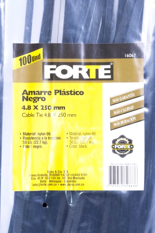 Ideal para sujetar y organizar cables.Amarre plastico, material: nylon 66, 100 pcs/ bolsa, tamaño: 4.8 x 250 mm, resistencia a la traccion: 50 lb. (22.7 kg), color: negro. Contiene 100 Unidades.