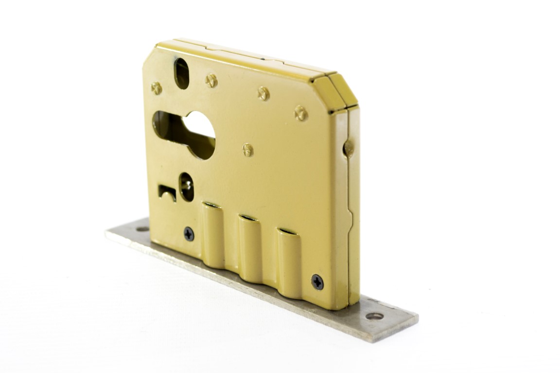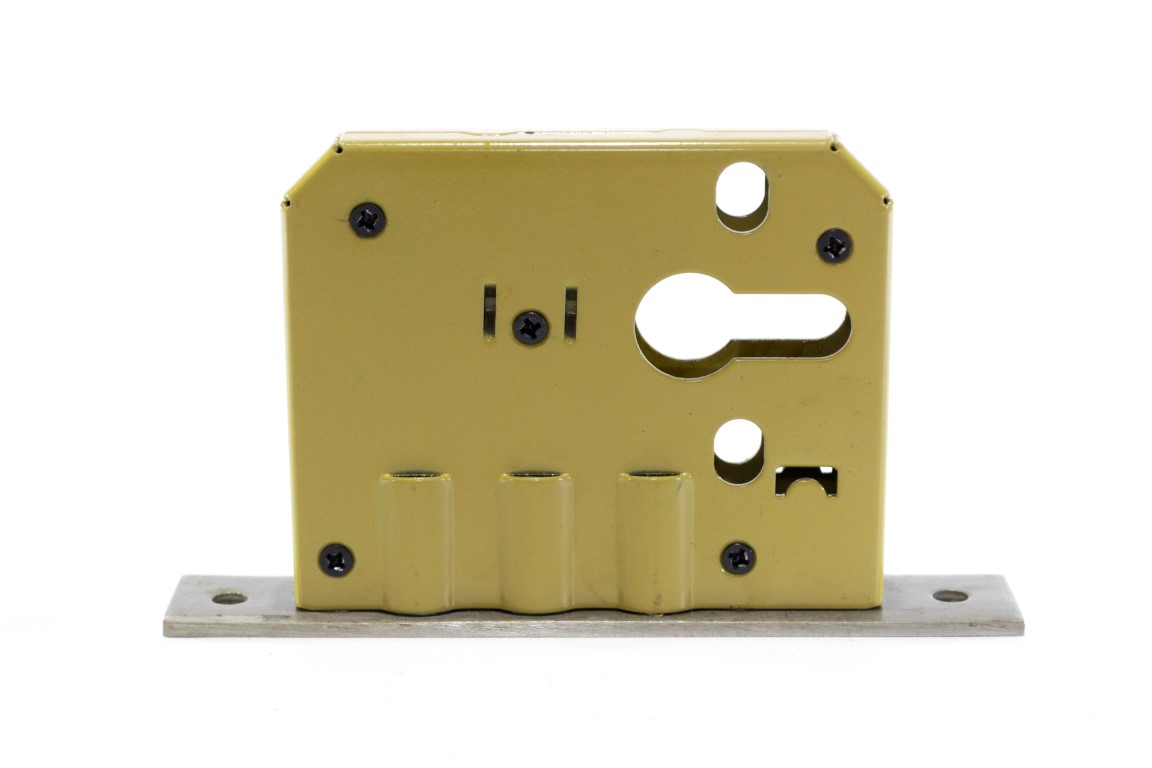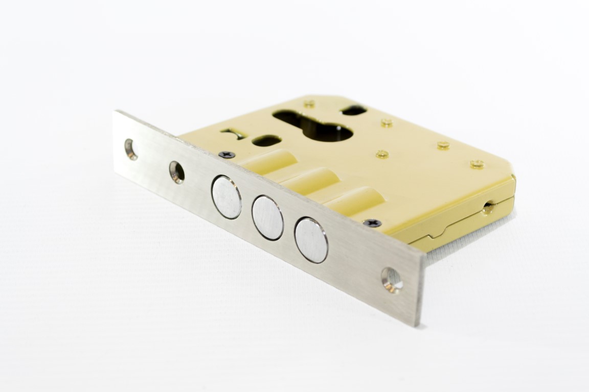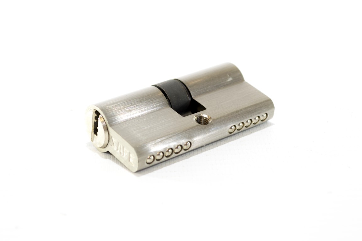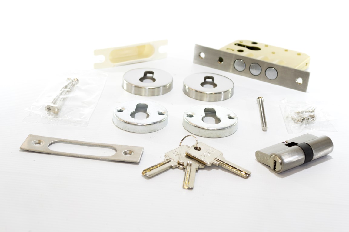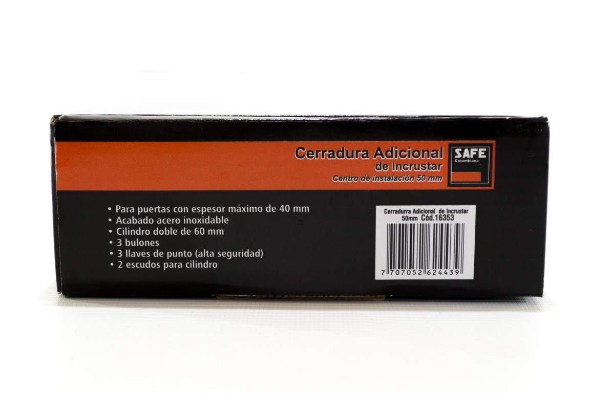 Juego de cerradura de incrustar auxiliar con 3 pasadores para mayor seguridad. Cuenta con un cilindro doble de 60 mm y un acabado en acero inoxidable que brinda resistencia y durabilidad. Centro de instalación de 50 mm y sistema de 3 bulones. Certificación ANSI grado 3. Incluye 3 llaves de punto en latón con acabado niquelado y escudos de protección.