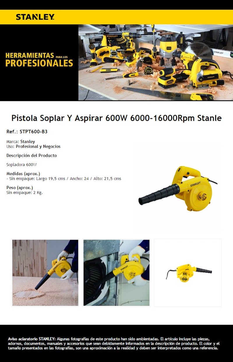 Motor 600W para aplicaciones profesionales - Velocidad Variable para mayor versatilidad - Bloqueo de encendido para uso continuo - Mango texturizado para mejor agarre - Acceso a carbones externo para un mantenimiento más rapido. Velocidad: 6.000-16.000 RPM - Flujo de Aire: 3.5 M3 por minuto ( 124 CFM) - Funciones: Soplado y aspirado. Aplicaciones: mantenimiento de equipos, talleres de electrodomesticos y Jardineria