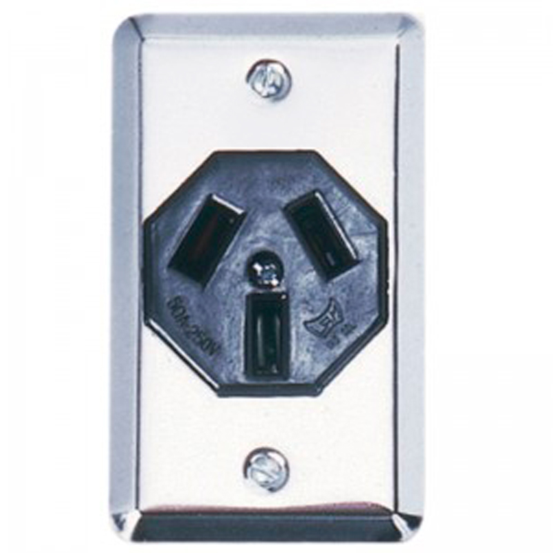 Tomacorriente para incrustar en pared con placa cromada de 3 polos. Capacidad de 50A amperios a 250 V. Especial para caja 2x4 pulgadas. Contactos y terminales en latón. Tornillos de terminales en hierro tropicalizado. Ideal para equipos que demanden alta potencia como ciertos electrodómesticos y algunas herramientas. Referencia 34001 de Ciles.