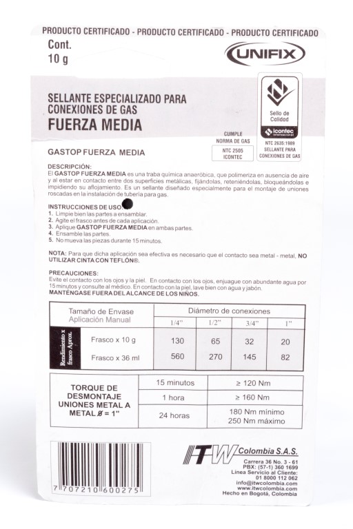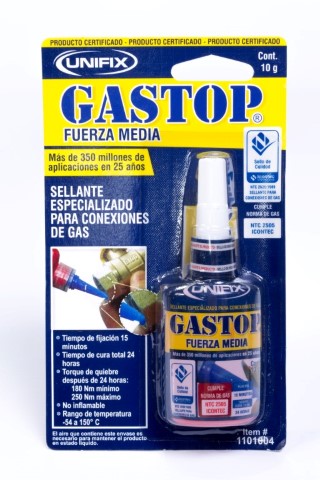 Diseñado especialmente para el montaje de uniones roscadas en la instalación de tubería para gas. Por su fuerza media se debe usar en piezas que requieran mantenimiento o donde se prevé un desmontaje a corto o mediano plazo. Polimeriza (seca, cura, endurece) en ausencia de aire y al estar en contacto entre dos superficies metálicas. o Evita la oxidación de las superficies. o Cubre todas las necesidades de fijación y sellado de tuberías.