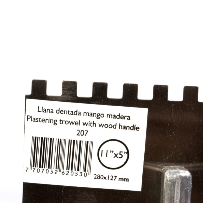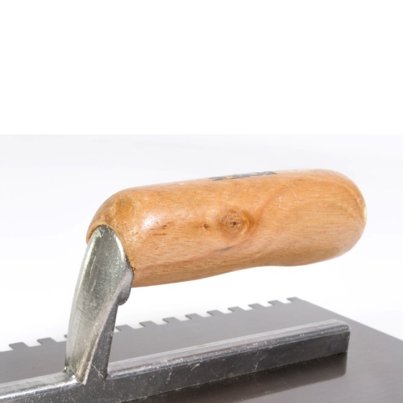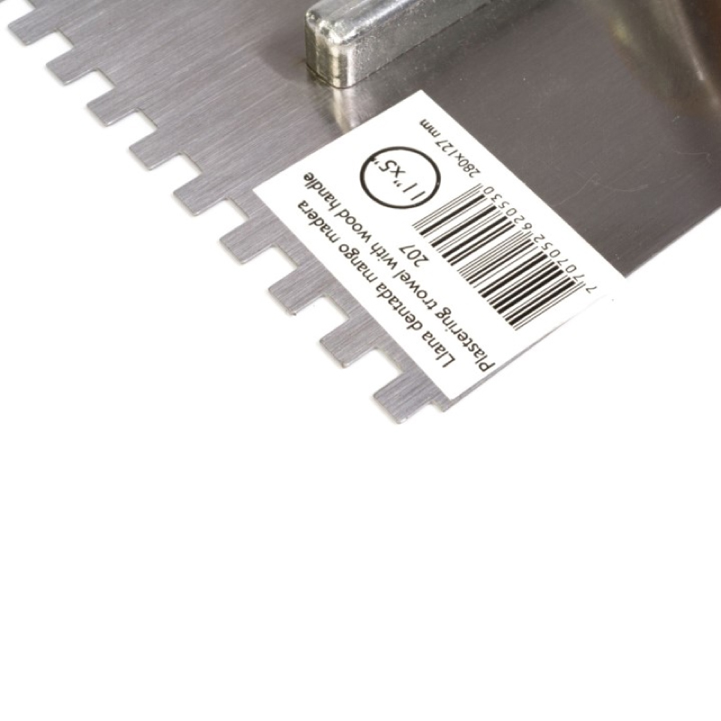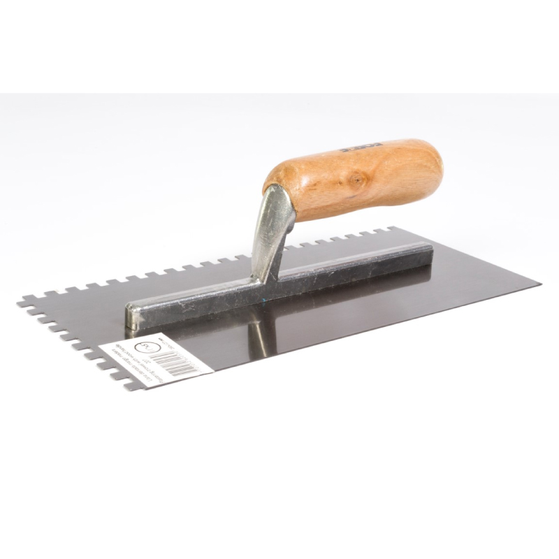 Cuerpo en Acero al Carbono. Mayor durabilidad y resistencia. Útil para trabajos de albañilería principalmente, para extender y aislar revoques, tanto en pisos como paredes, para pegado de pisos y enchapes. Paso pequeño. Medida 11pg X 5pg Dientes 1/4pg X 1/4pg. Mango Madera.