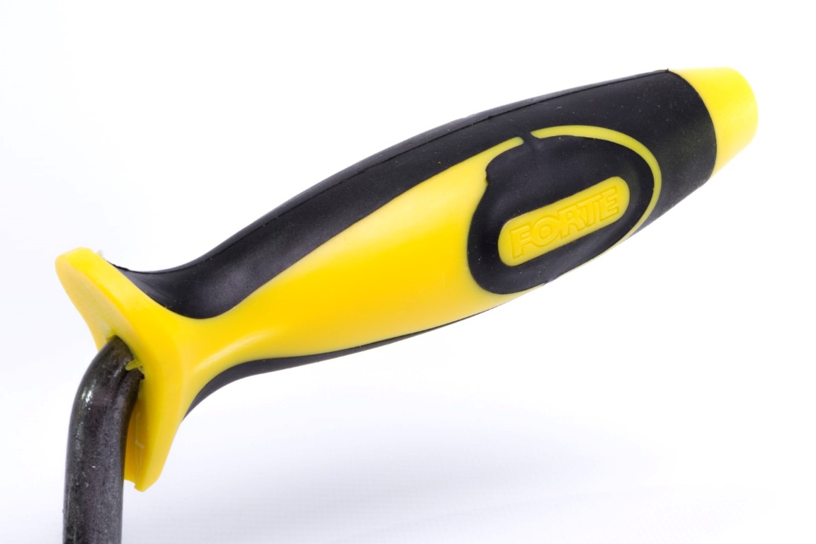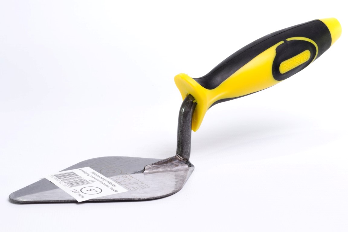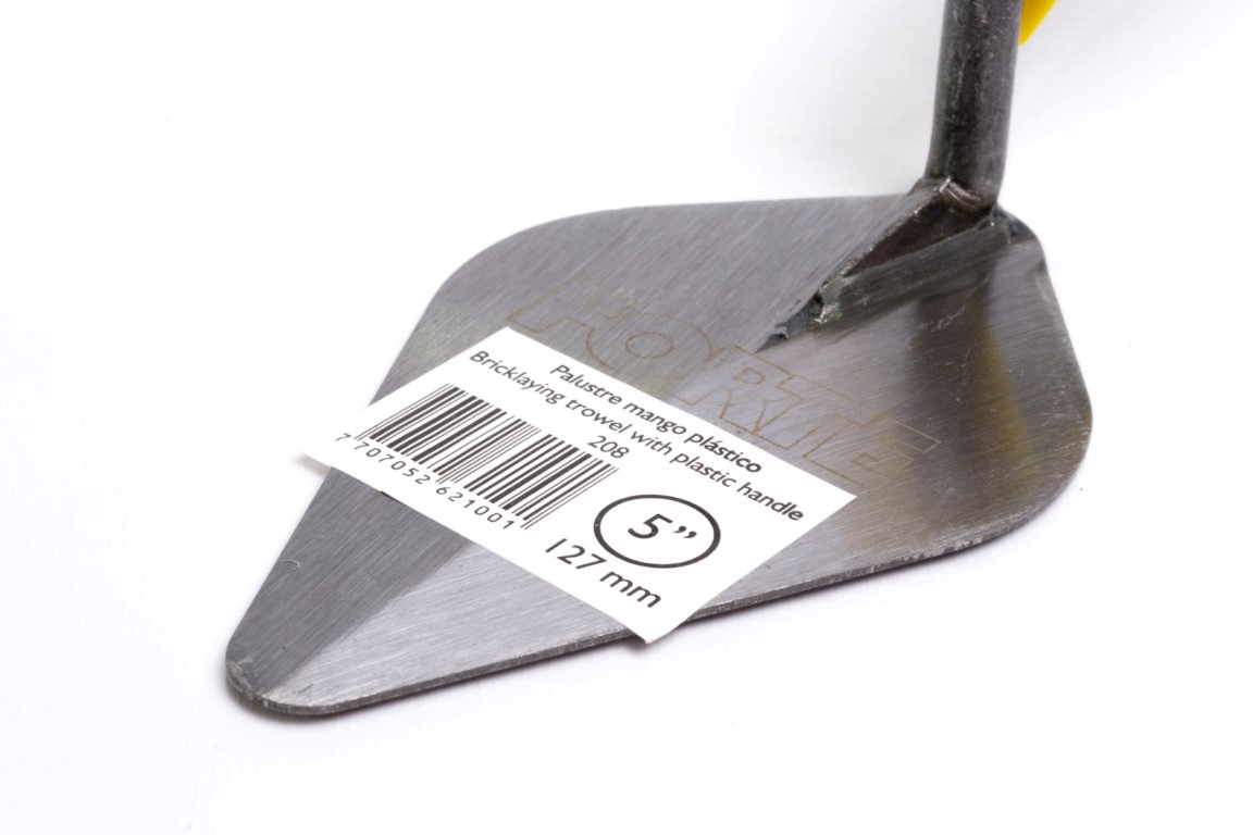 Cuerpo en Acero al Carbono, templado. Mayor durabilidad y resistencia. Mango soldado. Soldadura verificada con rayos X. Útil para trabajos de albañilería principalmente, para mezclar, recoger, transportar y extender masillas, revoques y pinturas. Mango Plástico ergonómico.