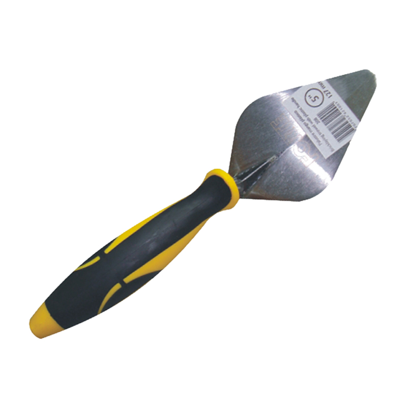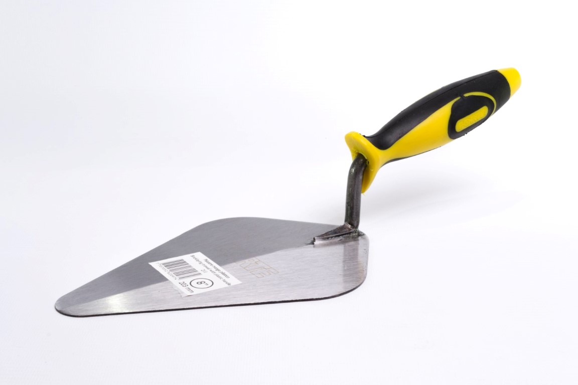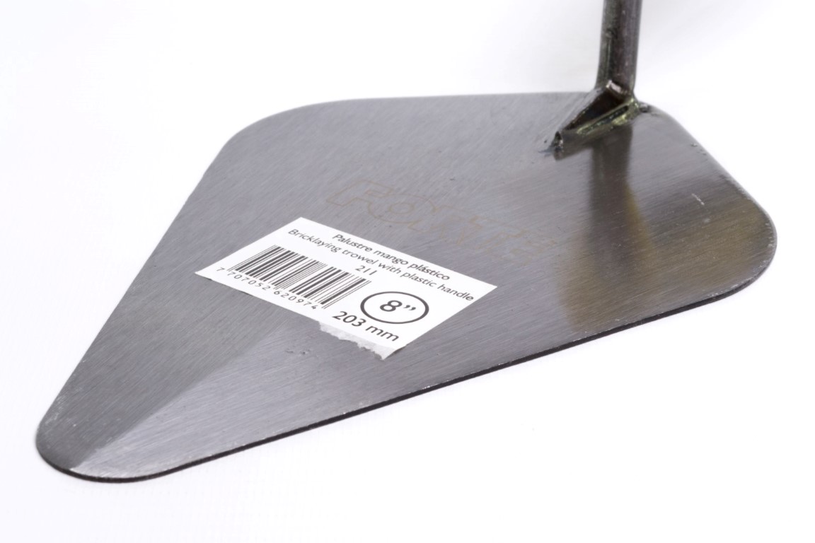 Cuerpo en Acero al Carbono, templado. Mayor durabilidad y resistencia. Mango soldado. Soldadura verificada con rayos X. Útil para trabajos de albañilería principalmente, para mezclar, recoger, transportar y extender masillas, revoques y pinturas. Mango Plástico ergonómico.