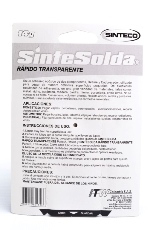 4. Pegante Epoxico para Soldar Rapido Transparente 14g 1102001 Sintesolda
