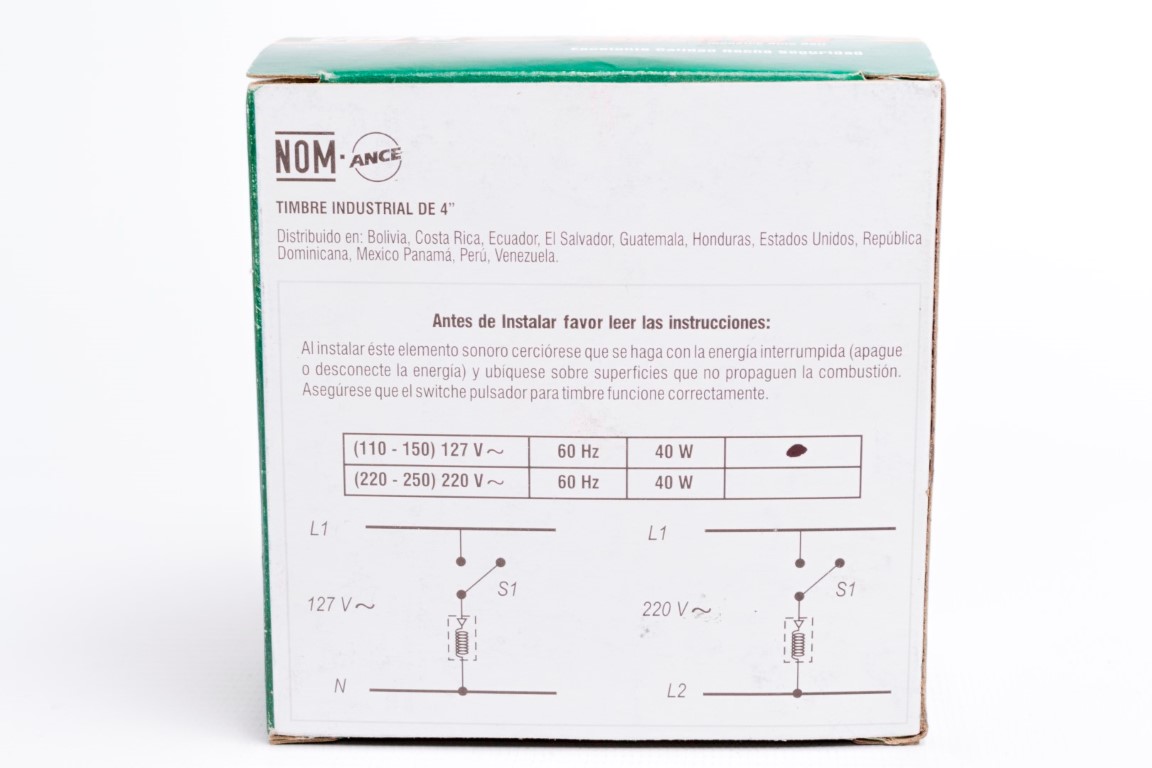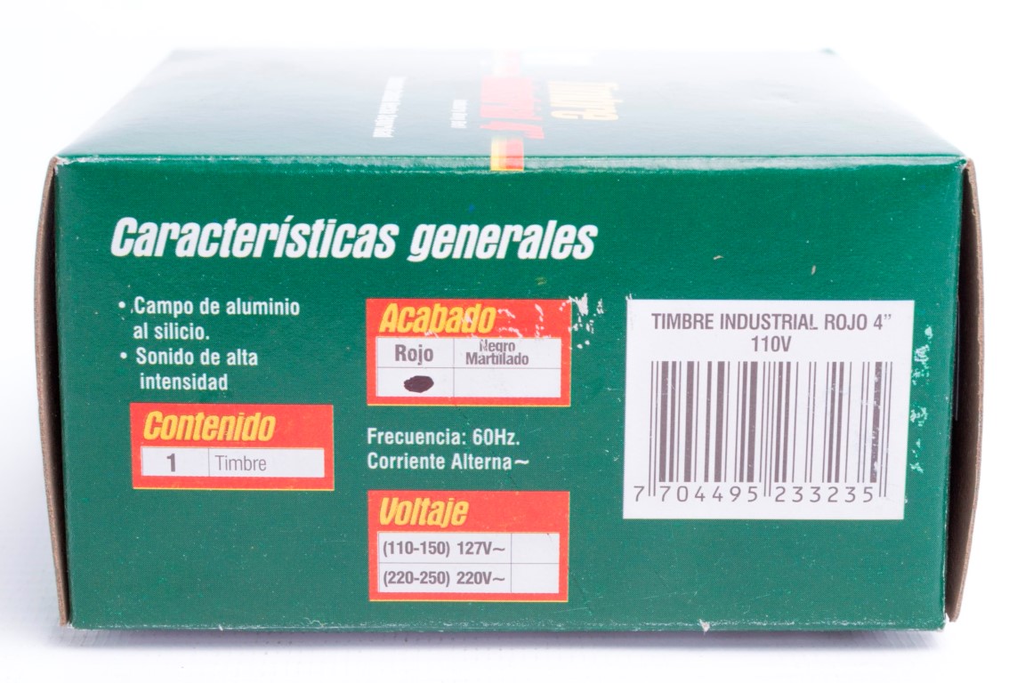Timbre industrial de 110/150 voltios, ideal para entornos industriales, colegios y bodegas. Cuenta con una campana en aluminio fundido para mayor resistencia y durabilidad, y una base en poliestireno, disponible en varios colores. Diseñado para ofrecer una señalización sonora potente y confiable en espacios de alto tráfico.