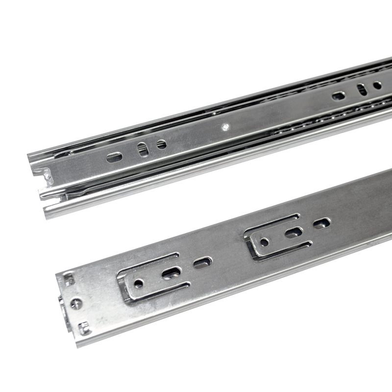 Riel de extensión total para carga liviana, fabricado en acero con recubrimiento galvanizado para mayor resistencia a la corrosión. Diseñado para soportar hasta 20 kg por par y garantizar un funcionamiento duradero con 25.000 ciclos de uso. Ideal para cajones en escritorios, muebles comerciales, residenciales y gabinetes de cocina donde se requiere una apertura completa. Disponible en longitudes de 300, 350, 400, 450 y 500 mm. No incluye tornillos.
