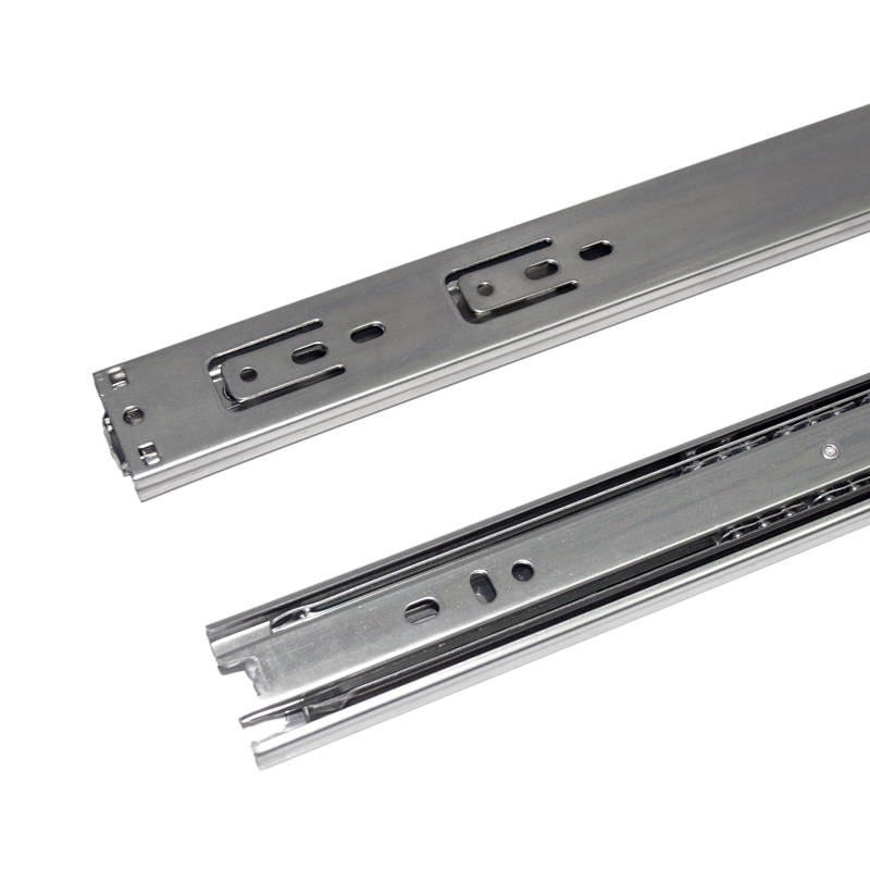 Riel de extensión total para carga liviana, fabricado en acero con recubrimiento galvanizado para mayor resistencia a la corrosión. Diseñado para soportar hasta 20 kg por par y garantizar un funcionamiento duradero con 25.000 ciclos de uso. Ideal para cajones en escritorios, muebles comerciales, residenciales y gabinetes de cocina donde se requiere una apertura completa. Disponible en longitudes de 300, 350, 400, 450 y 500 mm. No incluye tornillos.