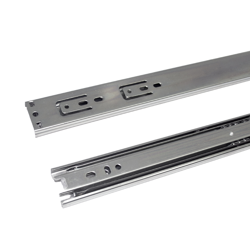 Riel de extensión total para carga liviana, fabricado en acero con recubrimiento galvanizado para mayor resistencia a la corrosión. Diseñado para soportar hasta 20 kg por par y garantizar un funcionamiento duradero con 25.000 ciclos de uso. Ideal para cajones en escritorios, muebles comerciales, residenciales y gabinetes de cocina donde se requiere una apertura completa. Disponible en longitudes de 300, 350, 400, 450 y 500 mm. No incluye tornillos.