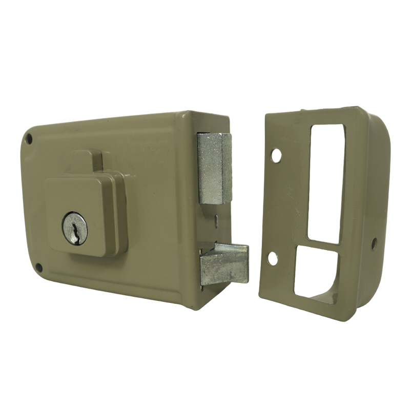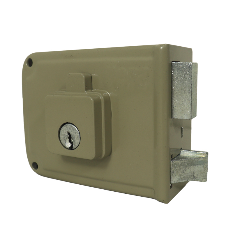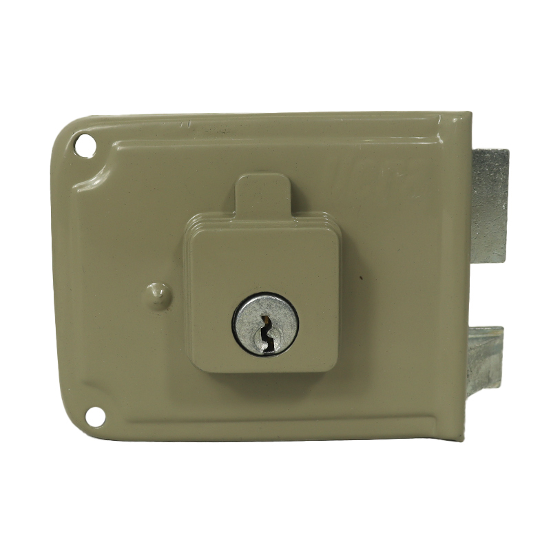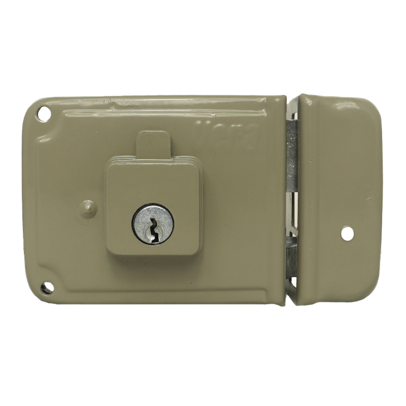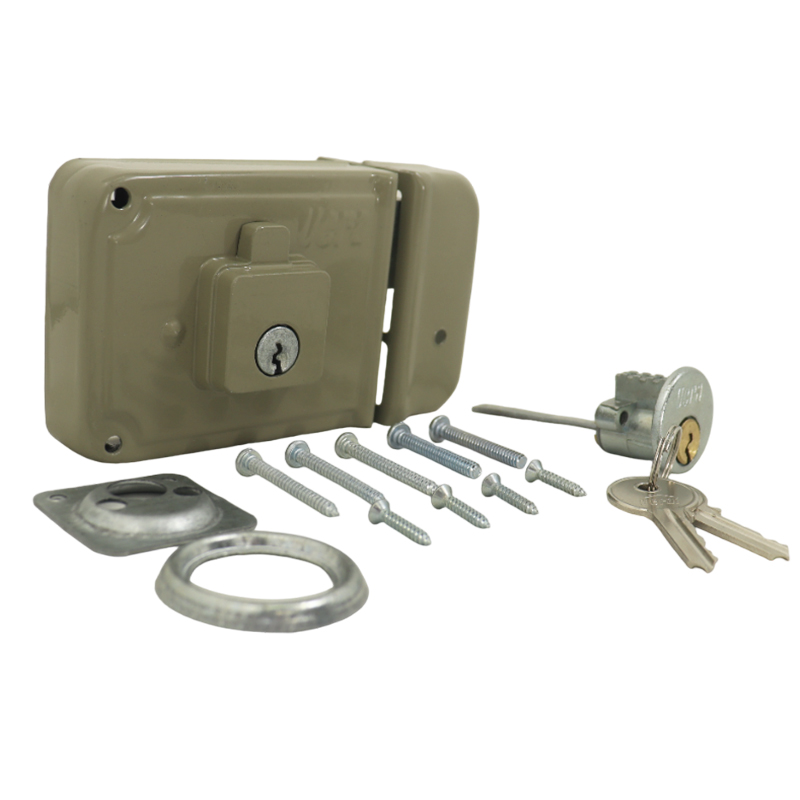 Cerradura de sobreponer diseñada para rejas o puertas auxiliares con apertura hacia la derecha. Cuenta con un macho cuadrado en zamak, que se acciona completamente en tres giros de llave, garantizando mayor seguridad. Su acabado en color beige es resistente a la intemperie, ideal para uso en exteriores. Centro de instalación de 50 mm y cilindro de 5 pines para un mejor nivel de protección.