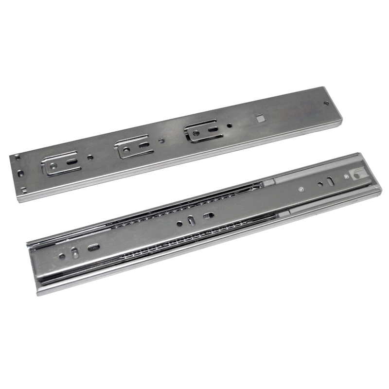 Riel de extensión total con cierre lento, diseñado para garantizar un deslizamiento suave y silencioso. Fabricado en acero con recubrimiento galvanizado para mayor resistencia y durabilidad. Soporta hasta 30 kg por par y cuenta con una vida útil de 15.000 ciclos de uso. Ideal para cajones en escritorios, muebles comerciales, residenciales y gabinetes de cocina donde se requiere una apertura completa con cierre amortiguado. Disponible en longitudes de 300, 350, 400, 450 y 500 mm.