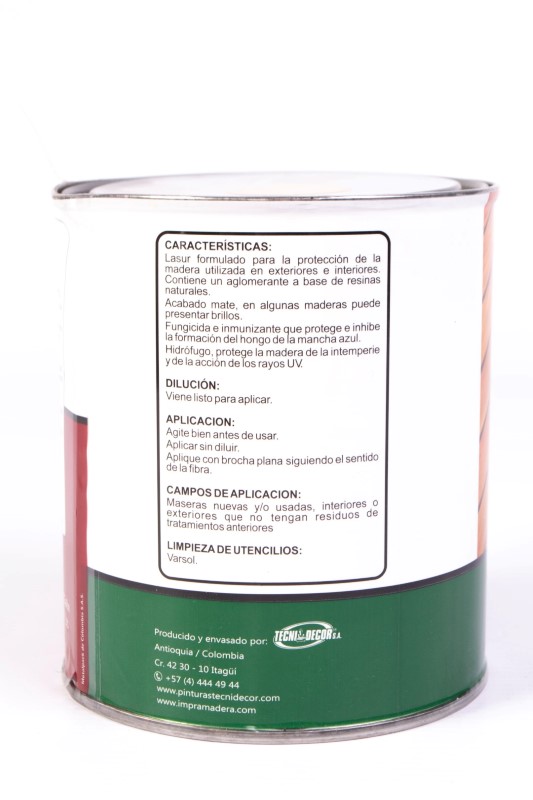 Lasur formulado para la protecciòn y decoraciòn de la madera. Contiene aglomerante a base de recinas uretànicas naturales. Acabado mate, en algunas maderas puede presentar brillo. Fungicida e inmunizante, protege la madera e inhibe la formaciòn del hongo de la mancha azul. Hidrofugo, proteje la madera de la intemperie y de la accion de los rayos UV. Finura de molienda 7.5 hegm NTC-557. / Sòlidos por peso:Teorico 40% Por volùmen:27% / PVC: No aplica / Viscocidad Copa Ford # 4: 9 a 11 segundos / Rendimiento Teòrico: 24 metros cuadrados por galòn / Relaciòn contraste: NA / Grado de Blanco: NA / Brillo Especular (60 grados * 16 h): NA / Lavabilidad: NA / Resistencia al agua: Cumple / Resis