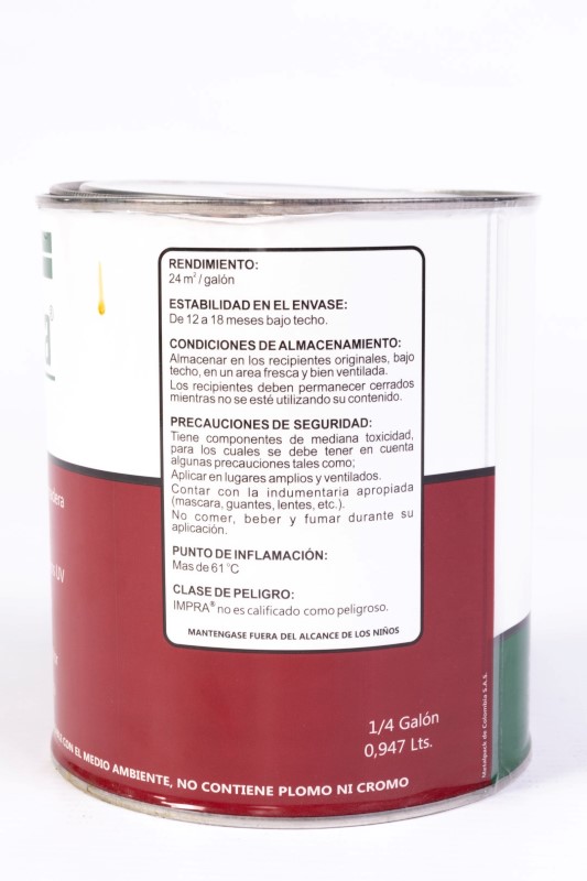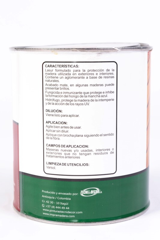 Lasur formulado para la protecciòn y decoraciòn de la madera. Contiene aglomerante a base de recinas uretànicas naturales. Acabado mate, en algunas maderas puede presentar brillo. Fungicida e inmunizante, protege la madera e inhibe la formaciòn del hongo de la mancha azul. Hidrofugo, proteje la madera de la intemperie y de la accion de los rayos UV. Finura de molienda 7.5 hegm NTC-557. / Sòlidos por peso:Teorico 40% Por volùmen:27% / PVC: No aplica / Viscocidad Copa Ford # 4: 9 a 11 segundos / Rendimiento Teòrico: 24 metros cuadrados por galòn / Relaciòn contraste: NA / Grado de Blanco: NA / Brillo Especular (60 grados * 16 h): NA / Lavabilidad: NA / Resistencia al agua: Cumple / Resis