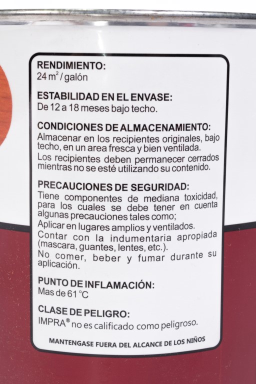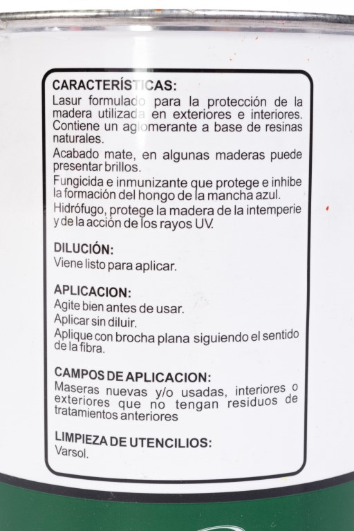 Lasur formulado para la protecciòn y decoraciòn de la madera. Contiene aglomerante a base de recinas uretànicas naturales. Acabado mate, en algunas maderas puede presentar brillo. Fungicida e inmunizante, protege la madera e inhibe la formaciòn del hongo de la mancha azul. Hidrofugo, proteje la madera de la intemperie y de la accion de los rayos UV. Finura de molienda 7.5 hegm NTC-557. / Sòlidos por peso:Teorico 40% Por volùmen:27% / PVC: No aplica / Viscocidad Copa Ford # 4: 9 a 11 segundos / Rendimiento Teòrico: 24 metros cuadrados por galòn / Relaciòn contraste: NA / Grado de Blanco: NA / Brillo Especular (60 grados * 16 h): NA / Lavabilidad: NA / Resistencia al agua: Cumple / Resis