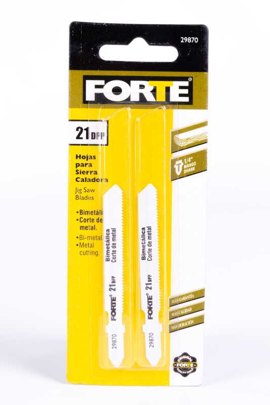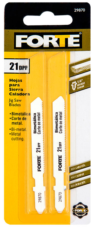 Las hojas bimetálicas FORTE® para sierra caladora poseen dientes endurecidos de acero rápido y han sido soldados electrónicamente a un respaldo flexible de acero para brindarles mayor durabilidad. Las hojas bimetálicas son ideales para cortar metal. Mientras menos dientes tengan por pulgada, más agresivo y más áspero será el corte. Consulta el sistema de Anclaje de la maquina antes de elegir la hoja.