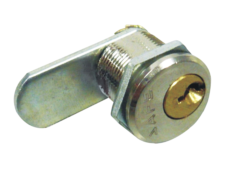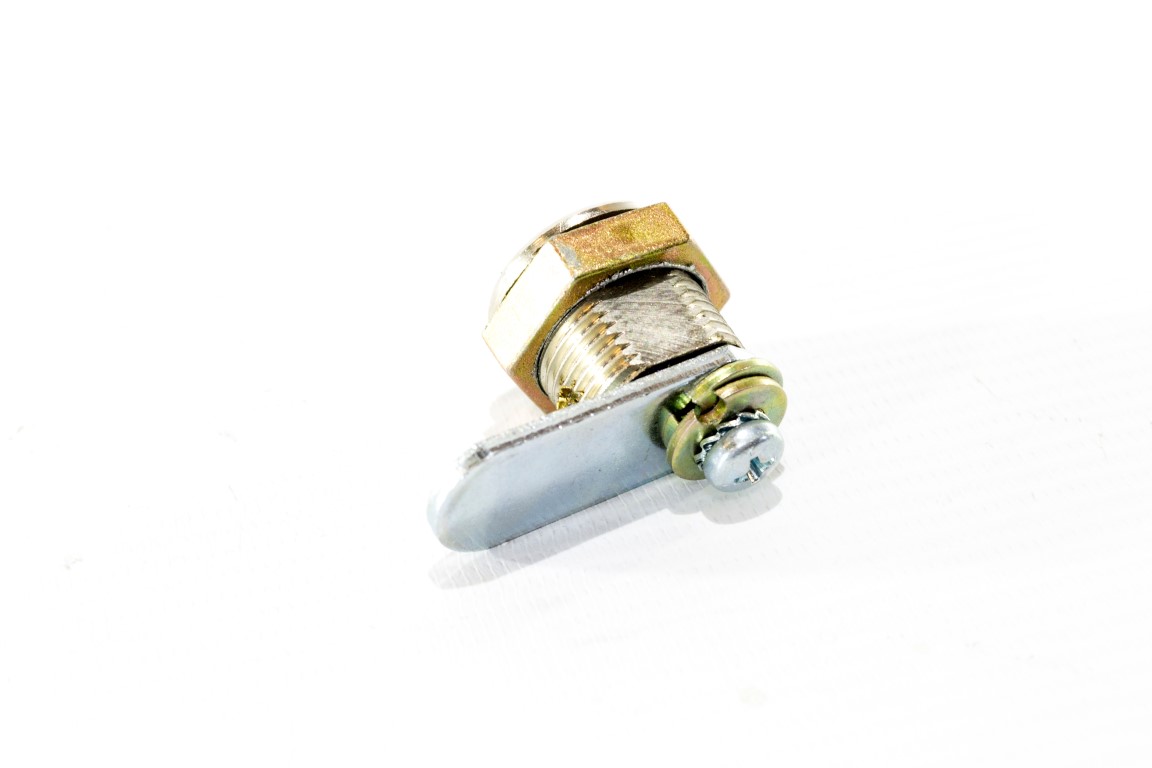 Cerradura 114 con acabado niquelado, diseñada para guanteras y muebles. Cuenta con un cilindro en latón macizo de alta durabilidad y llaves en latón intercambiables para mayor comodidad. El mecanismo de cierre opera con un giro del pasador de 90°, permitiendo que la llave solo ingrese en posición cerrada para mayor seguridad. Incluye porta cilindro niquelado y tuerca ajustable para adaptarse a diferentes espesores de puerta.