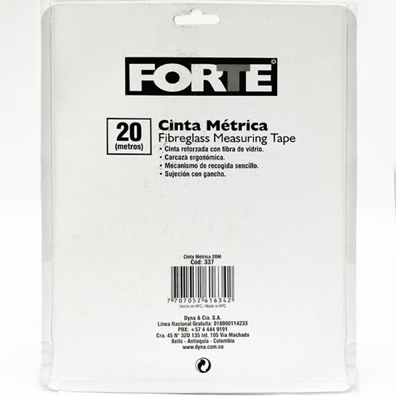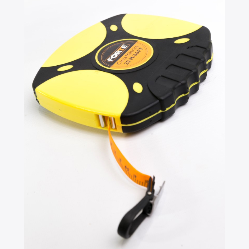 Cinta reforzada con fibra de vidrio. Carcaza ergonómica. Mecanismo de recogida sencillo y sujeción con gancho. 20 metros.