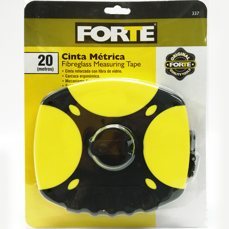 Cinta reforzada con fibra de vidrio. Carcaza ergonómica. Mecanismo de recogida sencillo y sujeción con gancho. 20 metros.
