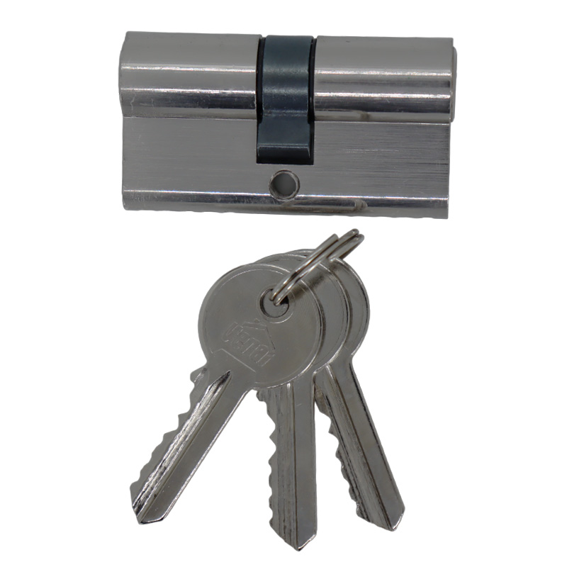 Cilindro doble tipo pera para cerradura de incrustar, con una longitud de 60 mm (30+30 mm centrado), cuenta con un sistema de cerradura convencional de 5 pines que proporciona mayor seguridad. Fabricado con un acabado en níquel satinado, es compatible con cerraduras de incrustar estándar. Incluye tres llaves y accesorios de instalación, garantizando un montaje sencillo y eficiente.