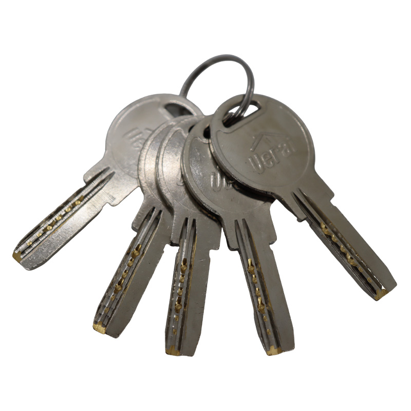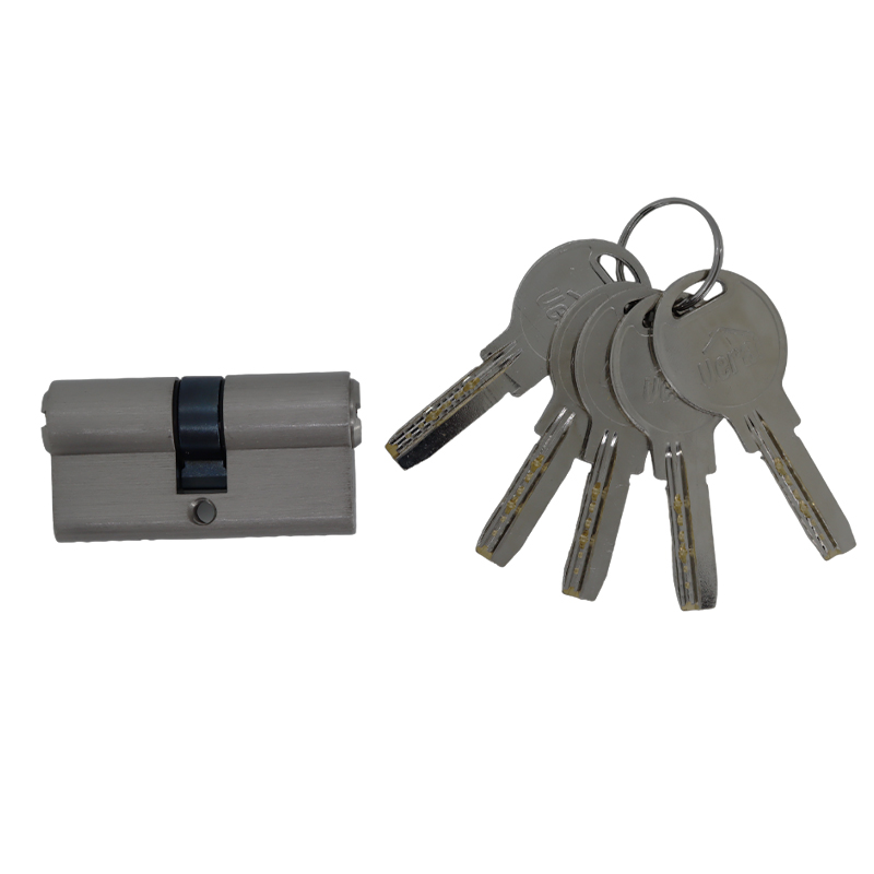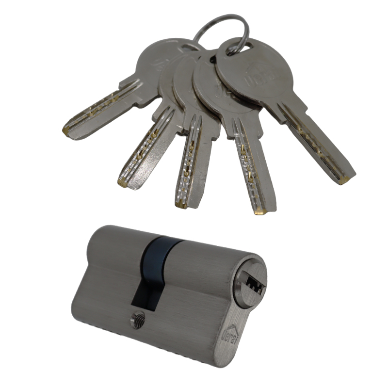 Cilindro doble tipo pera para cerradura de incrustar, con una longitud de 60 mm (30+30 mm centrado), está equipado con un sistema de llave de punto que proporciona mayor seguridad. Su acabado en níquel satinado le otorga durabilidad y resistencia a la corrosión. Compatible con cerraduras de incrustar estándar, incluye tres llaves y accesorios de instalación para un montaje fácil y eficiente.