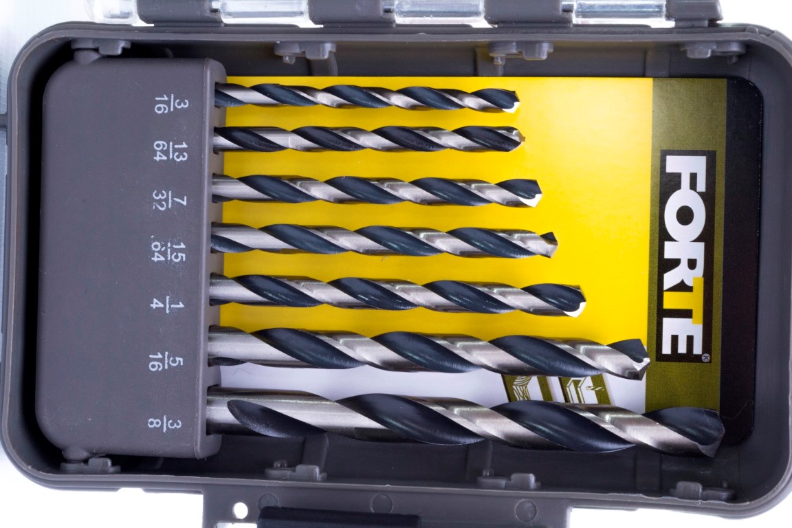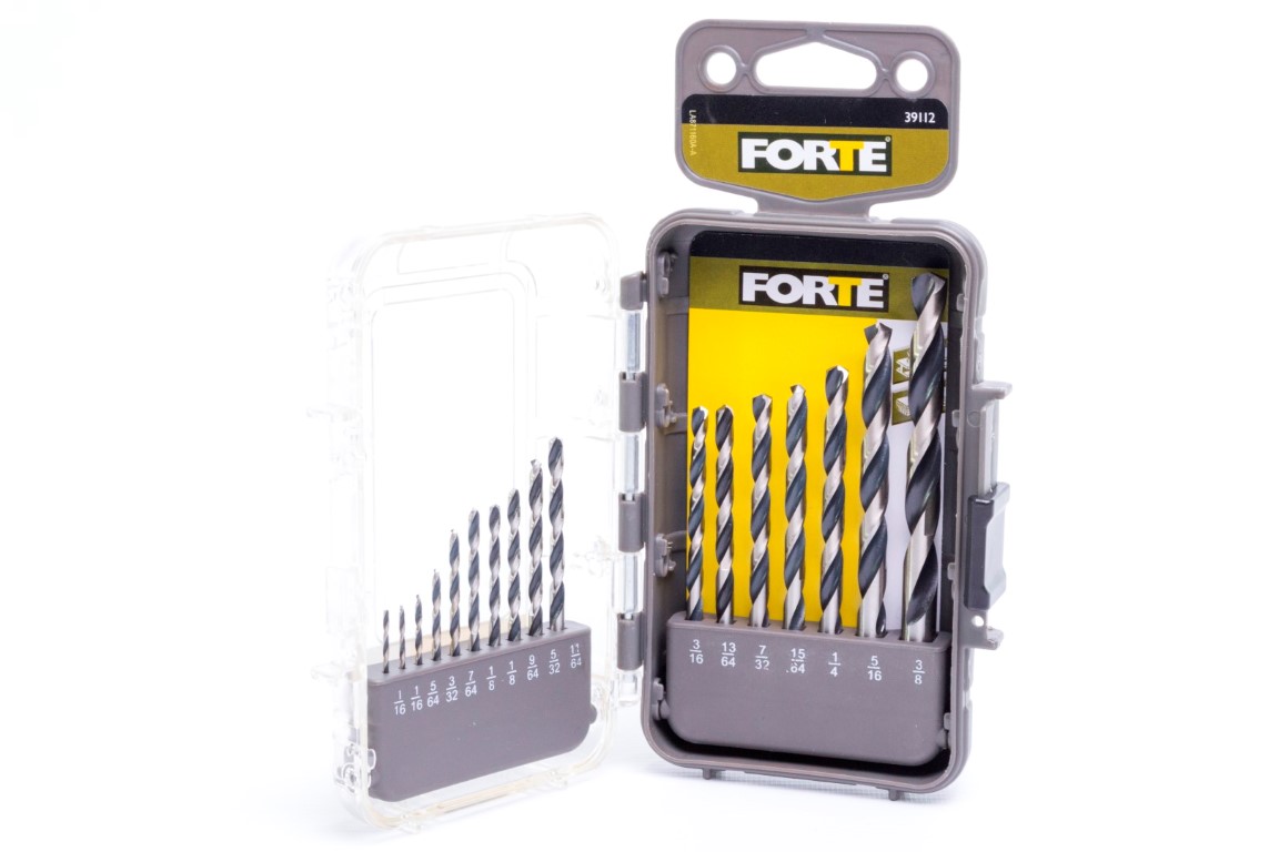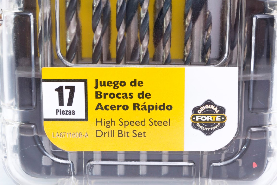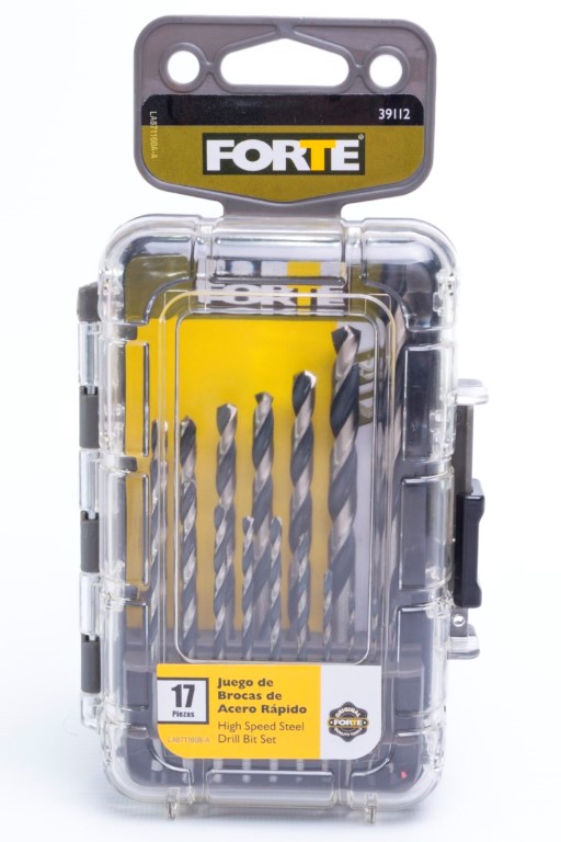 Brocas HSS 1/16 (x2), 5/64, 3/32,7/64, 1/8 (x2),9/64, 5/32, 11/64, 3/16, 13/64, 7/32,15/64, 1/4, 5/16, 3/8". Las brocas para metal FORTE® están hechas de acero rápido de la mejor calidad. Su punta de 135° inicia al contacto, perforando agujeros limpios y precisos. Utilicelas para metales ferrosos y no ferrosos como: acero suaves, láminas de metal y hierro fundido, bronce, cobre, aluminio, madera y PVC. Ofrece un práctico estuche para almacenamiento.