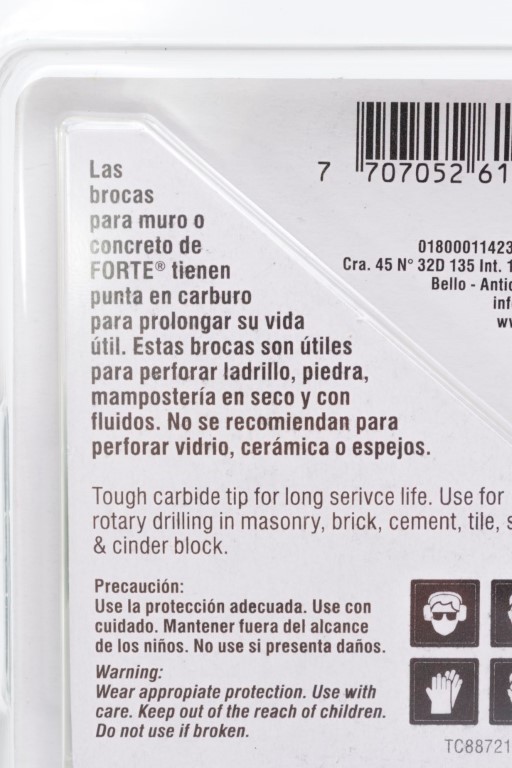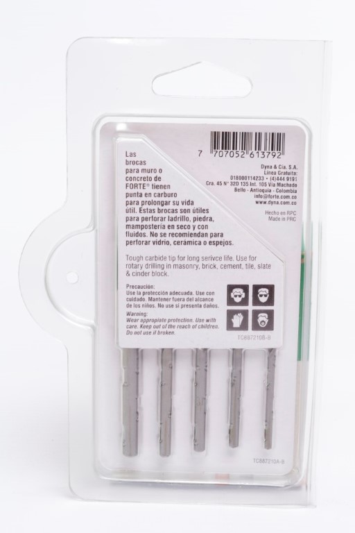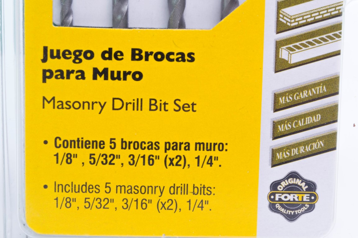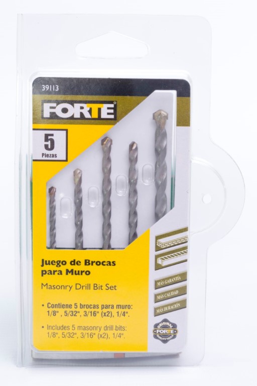 Brocas para Concreto: 1/8, 5/32, 3/16(x2), 1/4". Las brocas para muro o concreto de FORTE® tienen punta en carburo para prolongar su vida útil. Estas brocas son utiles para perforar ladrillo, piedra, mampostería en seco y con fluídos. No se recomiendan para perforar vidrio, baldosas de cerámica o espejos.