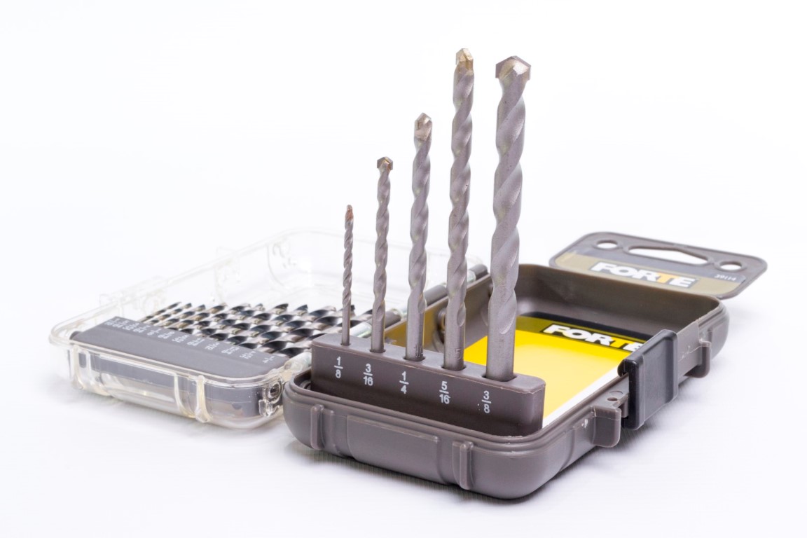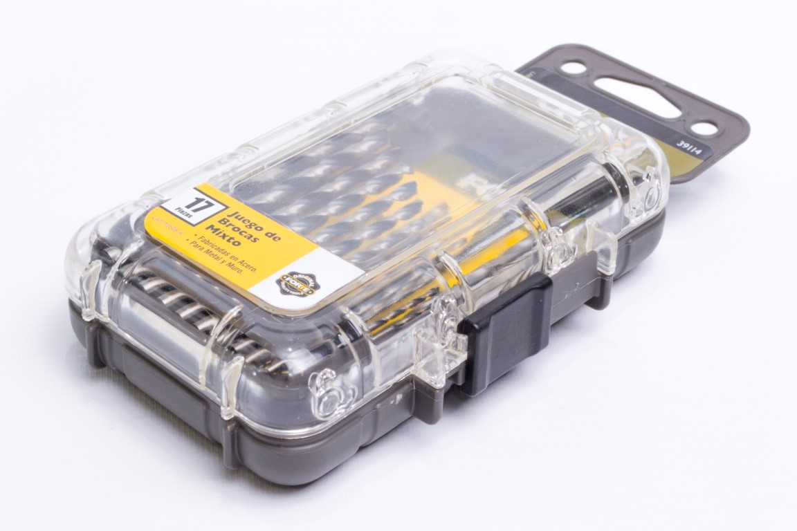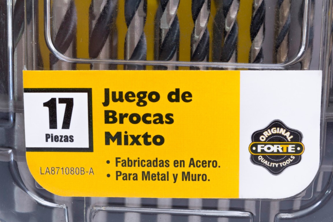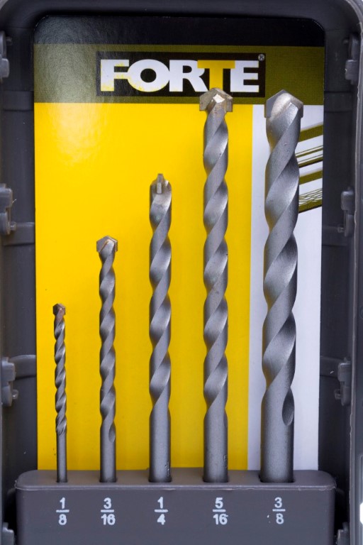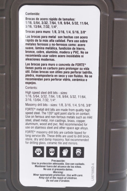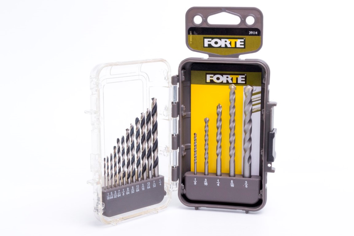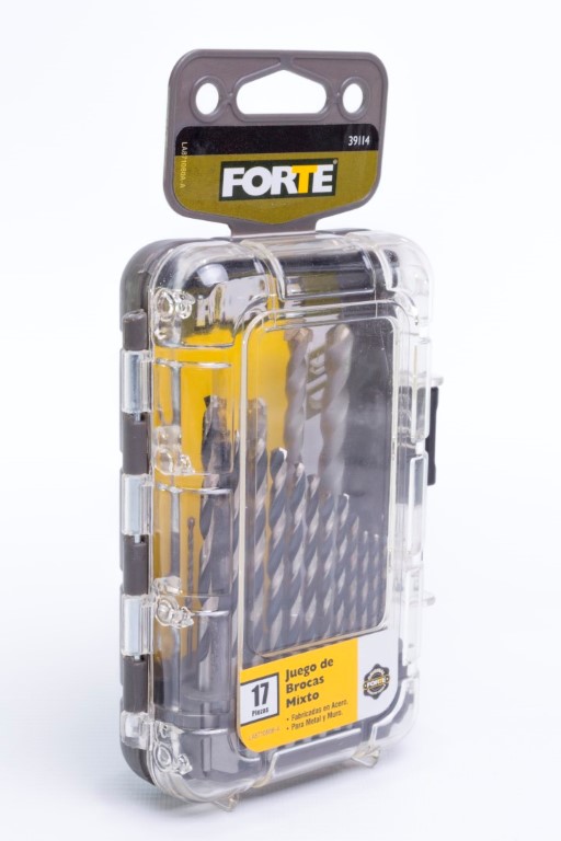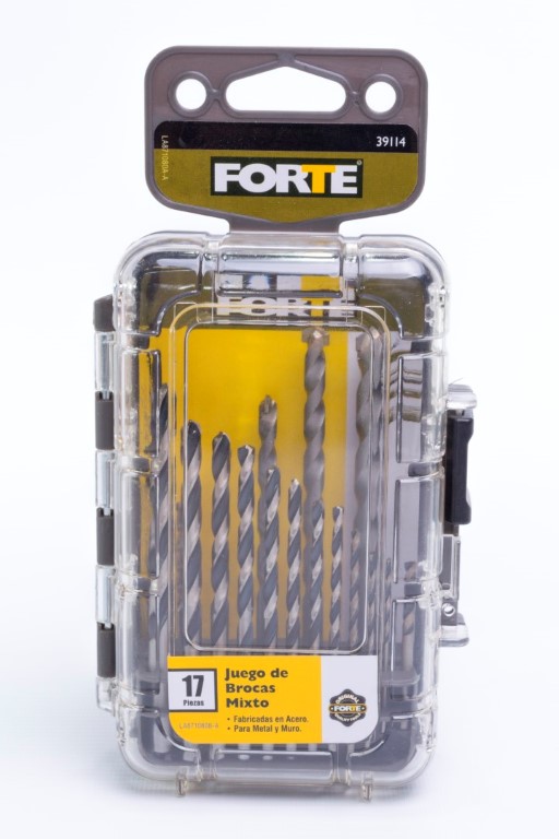 Brocas HSS 4241: 1/16, 5/64, 3/32, 7/64, 1/8, 9/64, 5/32, 11/64, 3/16, 13/64, 7/32, 1/4" Brocas para Muro: 1/8, 3/16, 1/4, 5/16, 3/8". Las brocas para metal FORTE® están hechas de acero rápido de la mejor calidad. Su punta de 135° de contacto, perfora agujeros limpios y precisos. Utiles para metales ferrosos y no ferrosos como: acero suaves, láminas de metal y hierro fundido, bronce, cobre, aluminio, madera y PVC. Las brocas para muro FORTE® tienen punta en carburo para prolongar su vida útil. Utiles para perforar ladrillo, piedra, mampostería en seco y con fluídos. Ofrece un práctico estuche.
