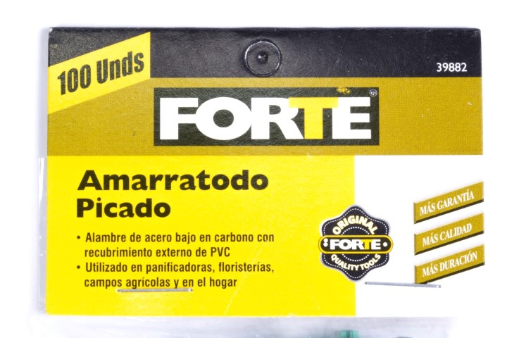 Alambre de acero bajo en carbono, con recubrimiento externo de pvc, bolsa de 100 unidades, disponible en color amarillo, azul, verde, rojo, gris,alta flexibilidad. Producto utilizado en las panificadoras, en las floristerias, campos agricolas y en el hogar como producto para asegurar o amarrar. Grado de toxicidad ninguna conocida.