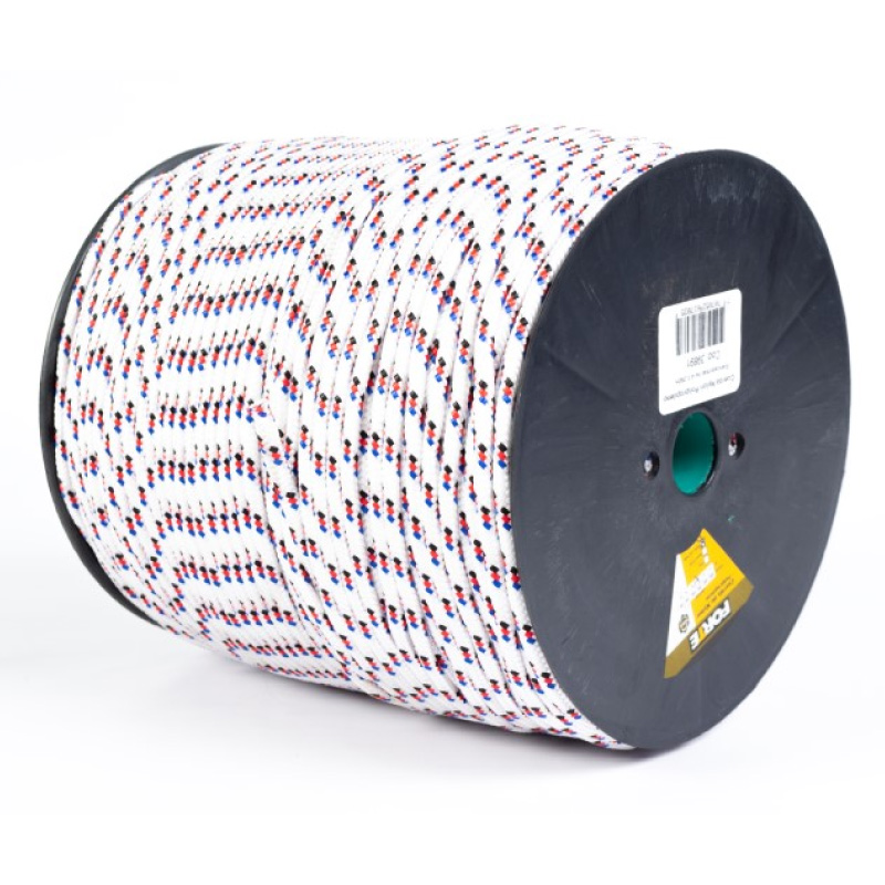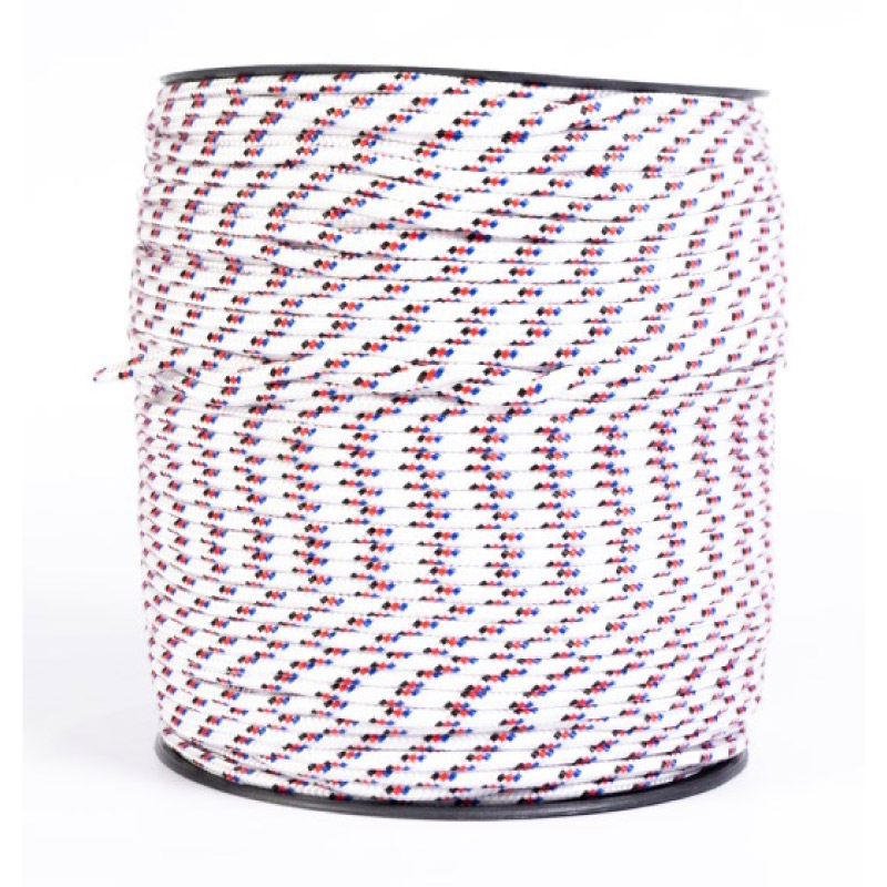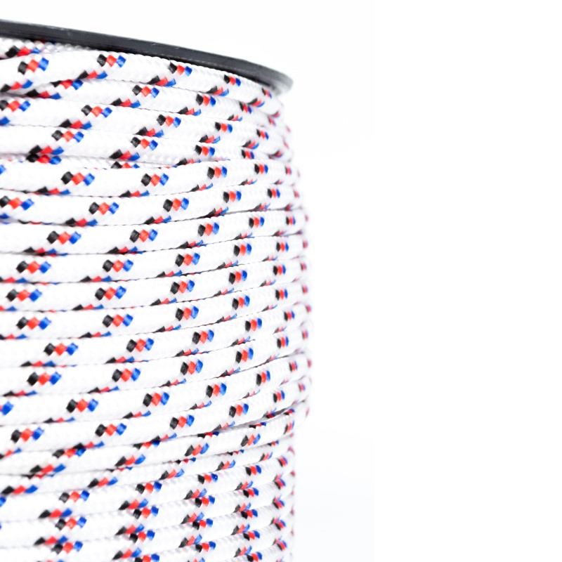 Carreta en forma cilíndrica con cuerda de nylon trenzada en su exterior de color blanca con pintas, poseen un alma de filamentos sin procesar,ademas de poliester y polipropileno texturizado. Dimensiones del producto: Carreta por 250 mts calibre 4 Ancho:15 cms, Largo:22cms. Producto utilizado en: ganaderia, agropecuarios,carpas,amarres,camiones,mallas y artesanias.