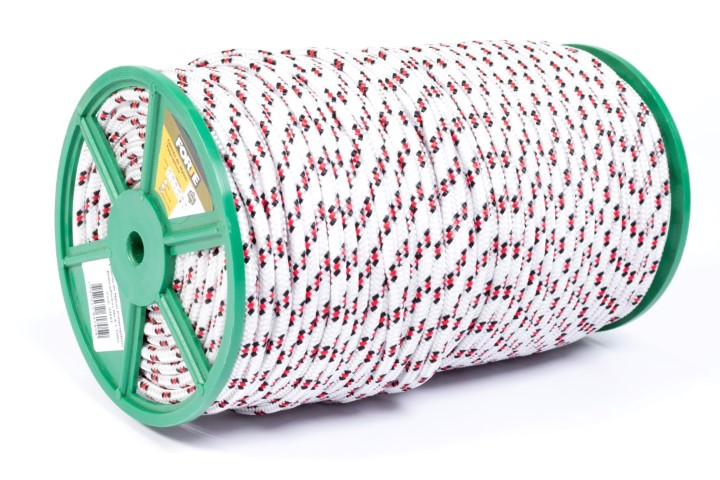 Carreta en forma cilíndrica con cuerda de nylon trenzada en su exterior de color blanca con pintas, poseen un alma de filamentos sin procesar,ademas de poliester y polipropileno texturizado. Dimensiones del producto: Carreta por 150 mts calibre 6 Ancho:15, cms, Largo:33 cms. Producto utilizado en: ganaderia, agropecuarios,carpas,amarres,camiones,mallas y artesanias.
