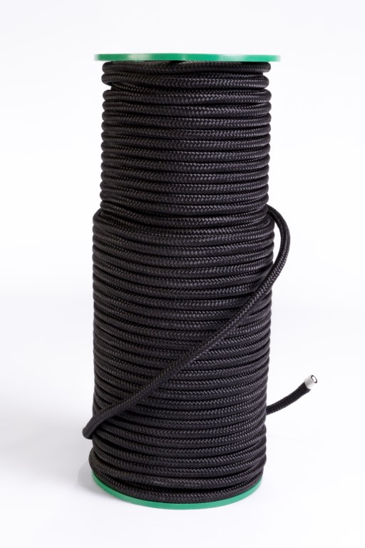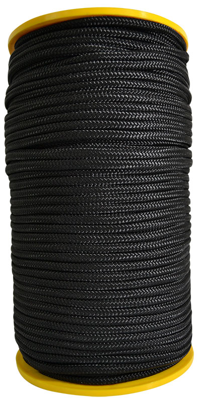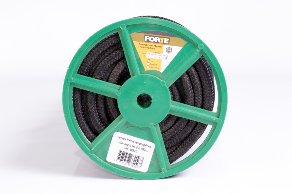 Carreta en forma cilíndrica con cuerda de nylon trenzada en su exterior de color negro. Poseen un alma de filamentos sin procesar,ademas de poliester y polipropileno texturizado. Dimensiones del producto: Carreta por 100 mts calibre 8 Ancho:15, cms, Largo:33 cms. Producto utilizado en: ganaderia, agropecuarios,carpas,amarres,camiones,mallas y artesanias.