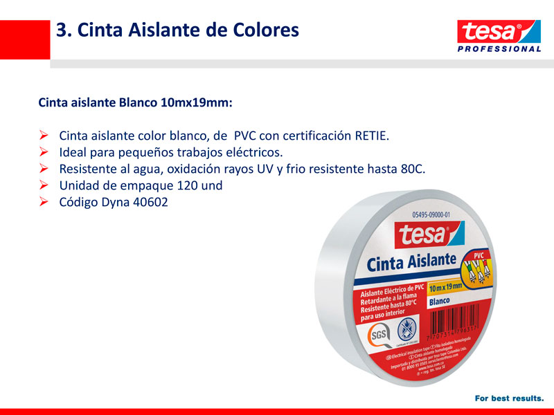 Cinta aislante color blanco, de PVC con certificacion RETIE, ideal para pequeños trabajos electricos, resistente al agua, oxidacion rayos UV y frio resistente hasta 80C de excelente capacidad dielectrica.