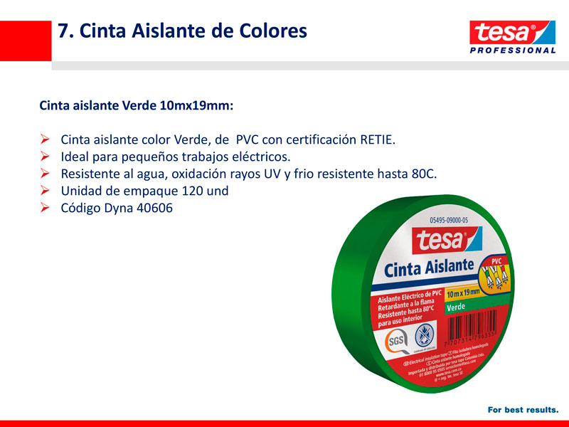 Cinta aislante color verde, de PVC con certificacion RETIE, ideal para pequeños trabajos electricos, resistente al agua, oxidacion rayos UV y frio resistente hasta 80C de excelente capacidad dielectrica.