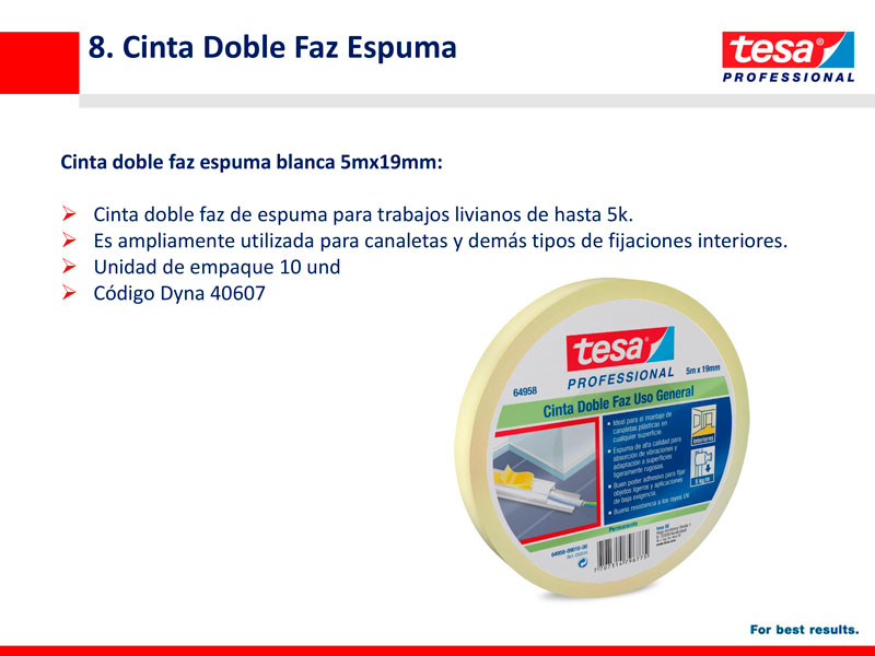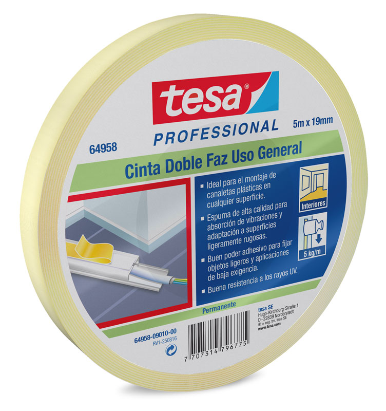 Cinta doble faz de espuma para trabajos livianos de hasta 5k. Es ampliamente utilizada para canaletas y demas tipos de fijaciones interiores.